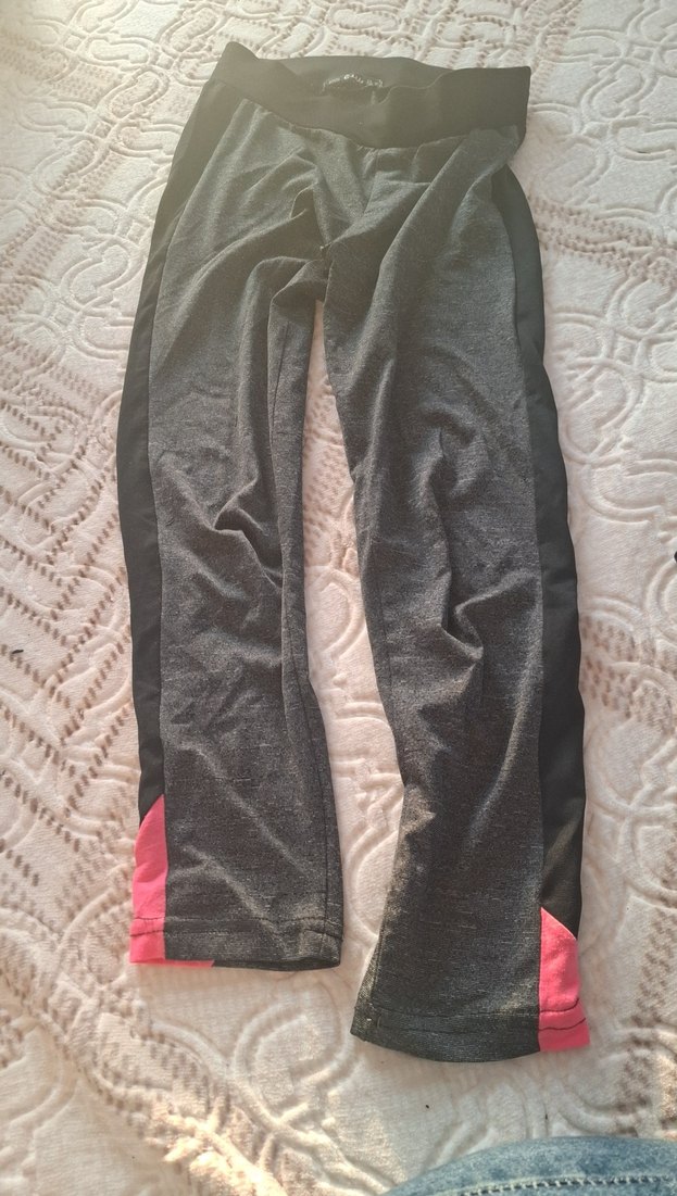 Gri renkli, fermuarlı detaylara ve pembe şeritlere sahip, sentetik kumaştan yapılmış kadın spor taytı.