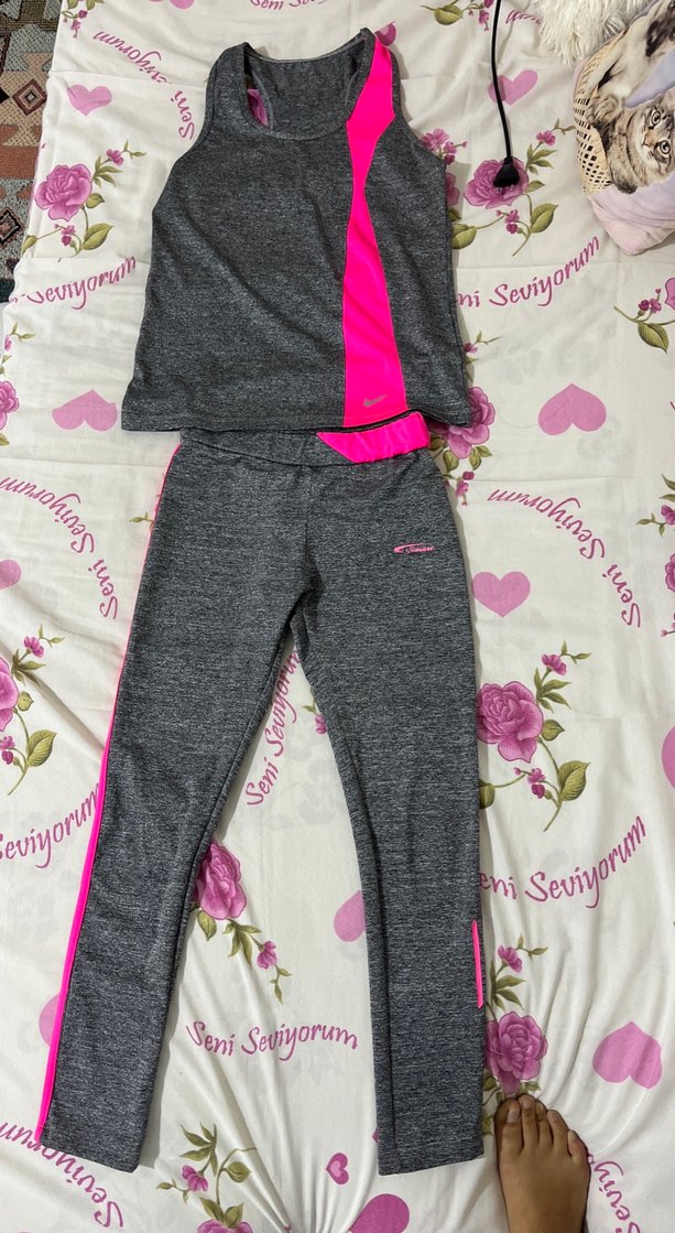Gri, orta boy, sentetik kumaştan kadın spor tayt. Ayarlanabilir velcro detayı ve 'Seni Seviyorum' baskısı bulunur. Spor ve günlük kullanıma uygundur.