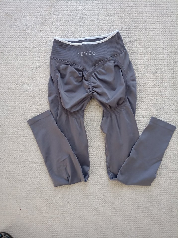 Sentetik kumaştan yapılmış, pilili detaylı, grimsi renkte, normal boyda, TEVEO logolu dar kesim kadın spor tayt. Spor ve sokak tarzı için uygundur. ♀️