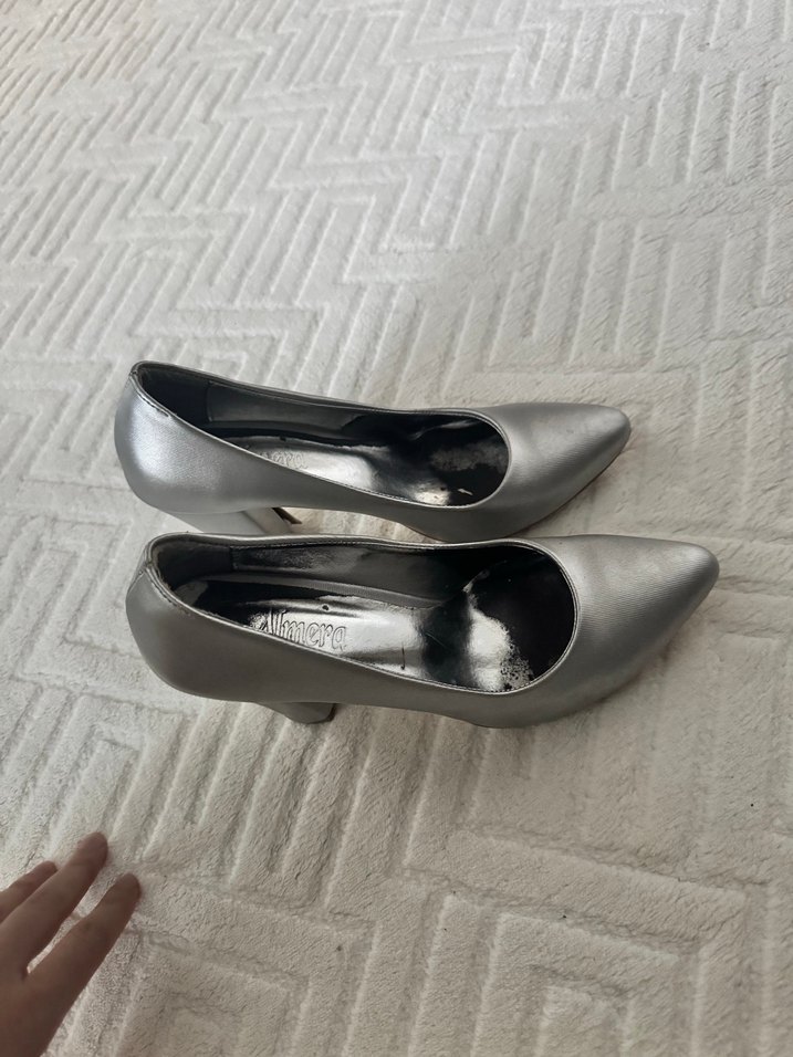 Gri renkli, lastik malzemeden kadın stiletto ayakkabılar. Sivri burunlu ve yüksek stilettolu, minimalist ve modern klasik tasarım, kadın için şık ve rahat.