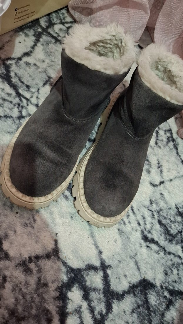 Gri süet kadın botları, dolgu topuklu ve kürk detaylıdır. Yumuşak kürk astar günlük sokak stili için ekstra sıcaklık ve konfor sağlar. ❄️