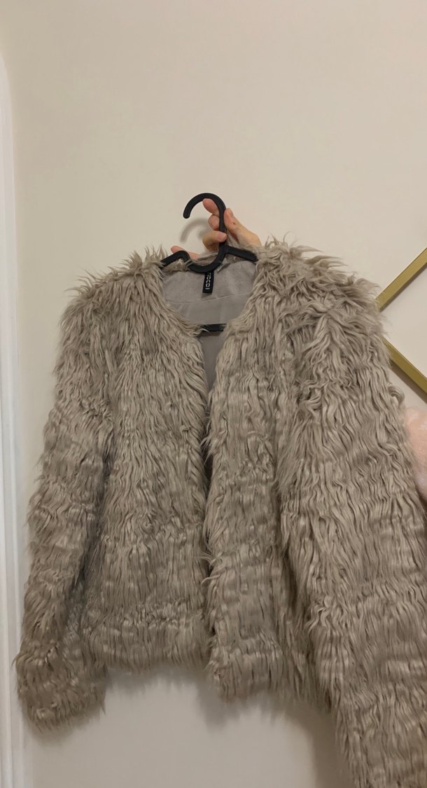 Gri renkte, suni kürk detaylı, normal uzunlukta ve uzun kollu, notched lapel yaka tasarımlı, sokak modasına uygun kadın ceketi.