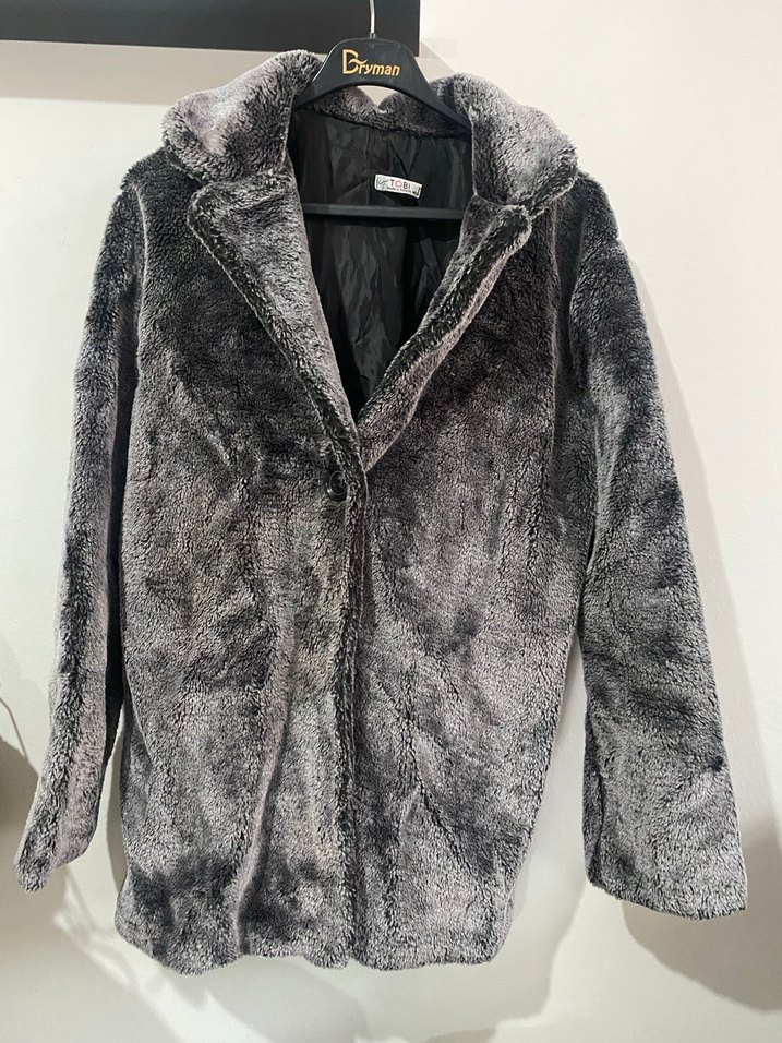 Gri, yakalı ve uzun kollu suni kürk ceket. Rahat kesimiyle günlük sokak modasına uygun, konforlu bir parça.