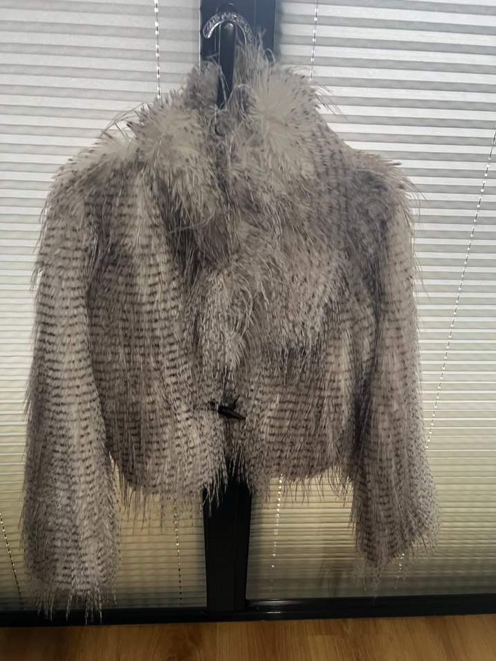 Gri suni kumaştan, kürk detaylı, uzun kollu, normal boy midi ceket. Bohem tarzda, fitted kesim ve yaka detaylıdır.