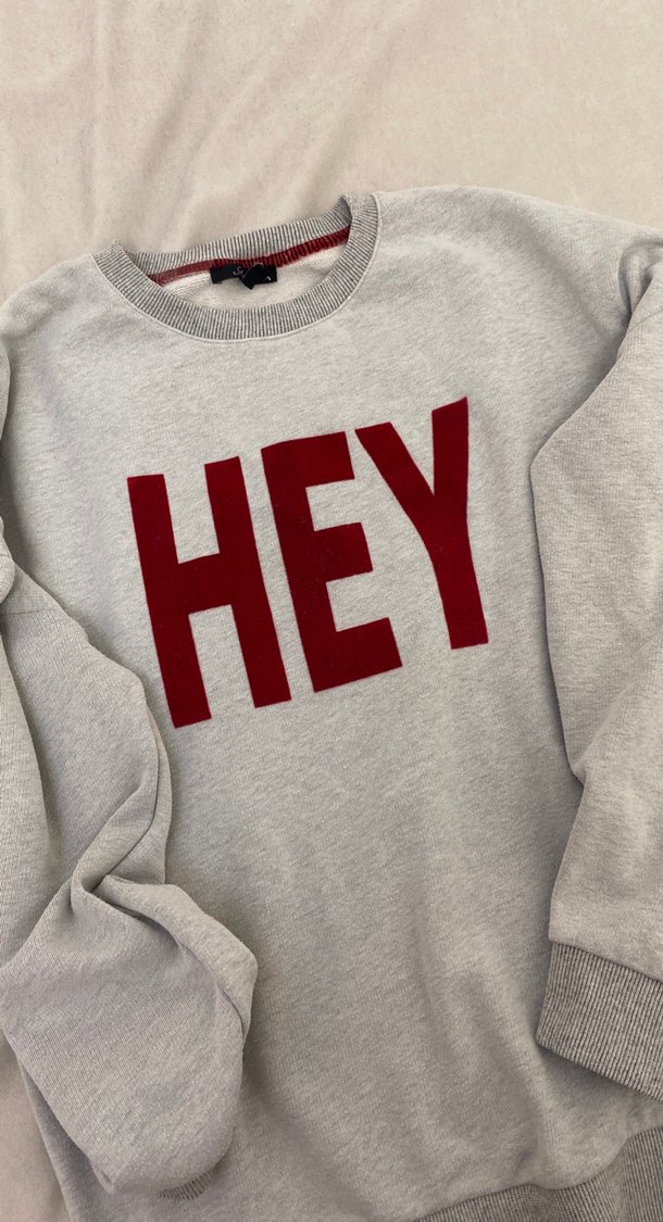 Gri renkte, yuvarlak yaka ve uzun kollu kadın sweatshirtü. Örme dokulu, bol kesim ve önünde kırmızı "HEY" baskısı bulunur. Yumuşak ve sıcak kumaştan üretilmiştir.