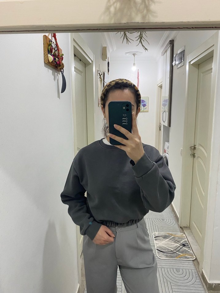 Gri renkte, uzun kollu, salaş kesim beli lastikli kadın sweatshirt. Yumuşak ve sıcak kumaştan, günlük rahat kullanıma uygun şık bir parça.