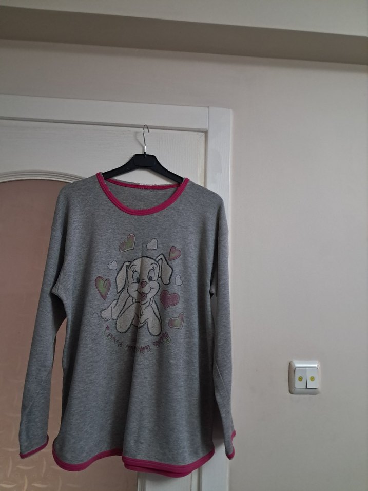 Gri, uzun kollu, yuvarlak yakalı kadın sweatshirtü. Örme kumaş, baskılı desen ve pembe detaylara sahip, rahat sokak stili için uygun. ufak tefek defosu var, giymeye engel değil, evde, köyde falan giyilebilir,