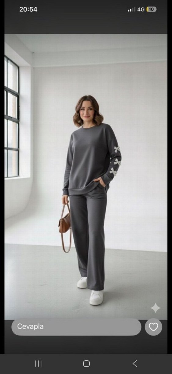 Gri renkte, uzun kollu ve yuvarlak yakalı kadın eşofman takımı. Kollarda zarif fiyonk detayları bulunur. Yumuşak ve sıcak kumaştan, rahat kesim ve midi boyda günlük kullanım için uygundur.