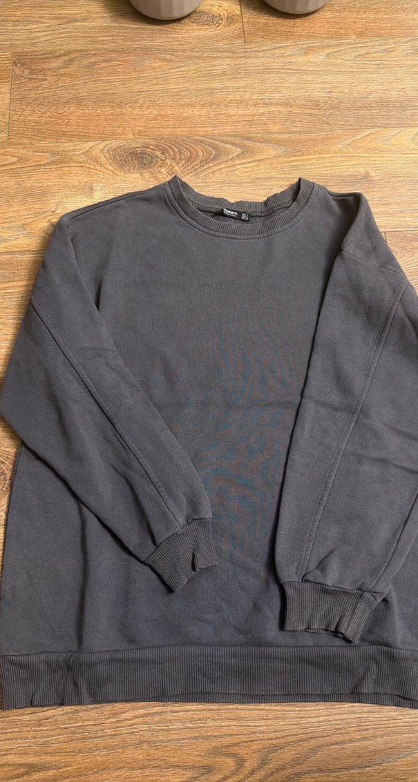 Yuvarlak yaka ve uzun kollu, bol kesim gri kadın sweatshirt. S beden ama oversize oldugu icin M bedene de olur