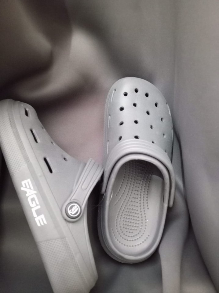 gri erkek terlik, yumuşak kauçuk malzemeden üretilmiş, 'EAGLE' baskılı ve ayarlanabilir Velcro bantlıdır. Günlük kullanım için rahat ve minimalist tasarım.