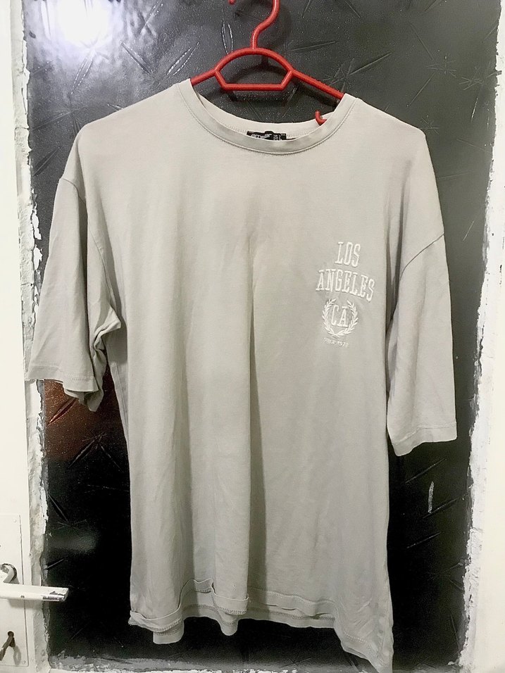 Gri renkli keten Kadın tişört, loose fit kesime sahip kısa kollu ve bisiklet yaka. Üzerinde Los Angeles baskısı bulunur, rahat sokak stiline uygun. Günlük kullanım için ideal.