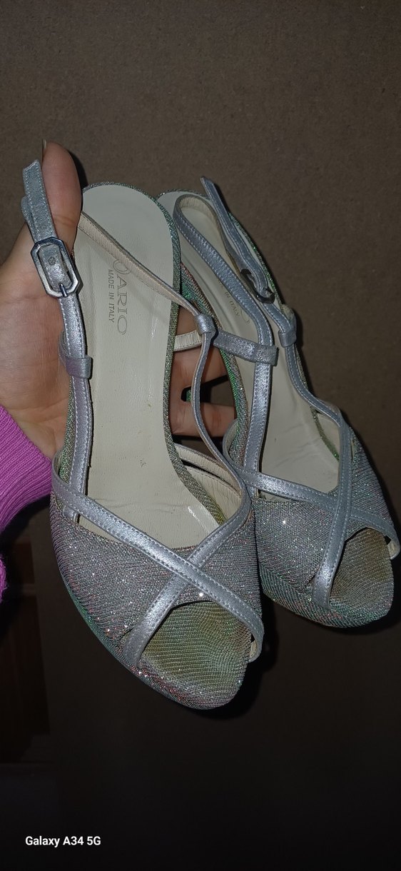 Gri, saten dokulu, tokalı bantlı yüksek topuklu gece ayakkabısı. ARIO markalı, desen içermeyen modern tasarım.