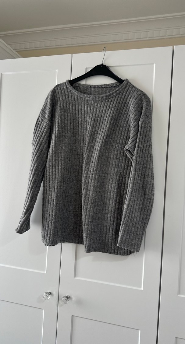 Gri renkli, bisiklet yakalı ve uzun kollu örme kazak. Yumuşak keten kumaştan, bol kesim ve sade rahat tarzda, günlük kullanım için uygundur.