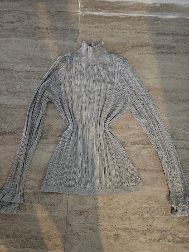 Gri renkli, triko dokulu, boğazlı ve uzun kollu kadın kazak. Yumuşak , normal boyda ve rahat bir sokak stili için uygun.