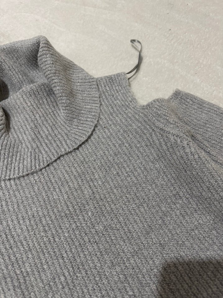 Gri renkli, boğazlı ve uzun kollu, yün triko kumaştan yapılmış, rahat ve günlük kullanıma uygun dar kesim kazak.