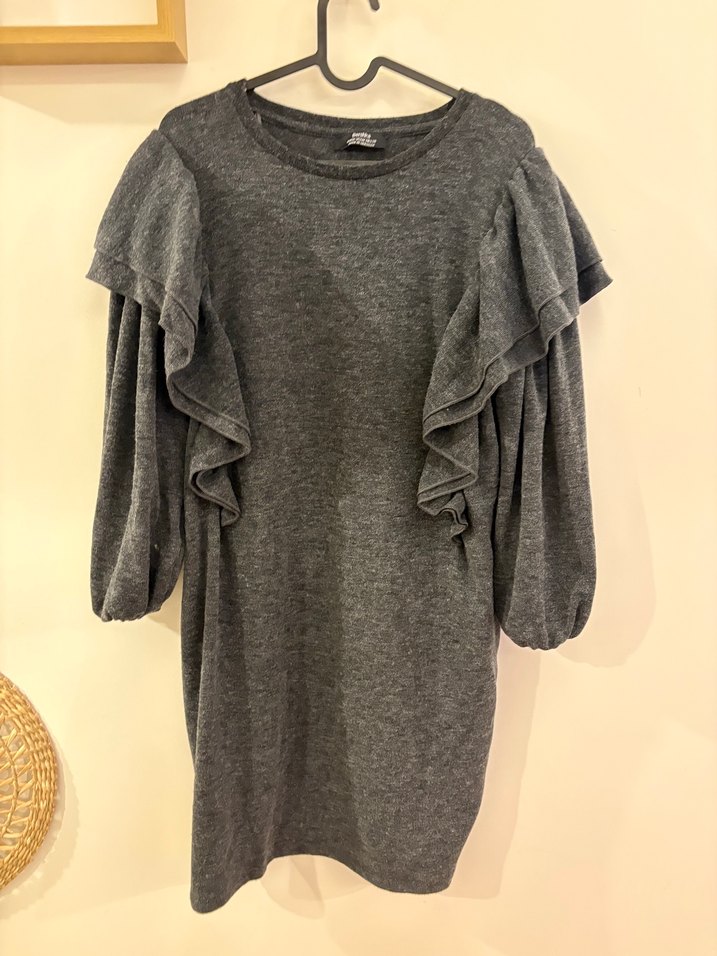 Gri yün triko elbise, yuvarlak yaka ve fırfırlı uzun kollu tasarıma sahiptir. Salaş kesim ve midi boydadır, günlük sokak stiline uygundur.