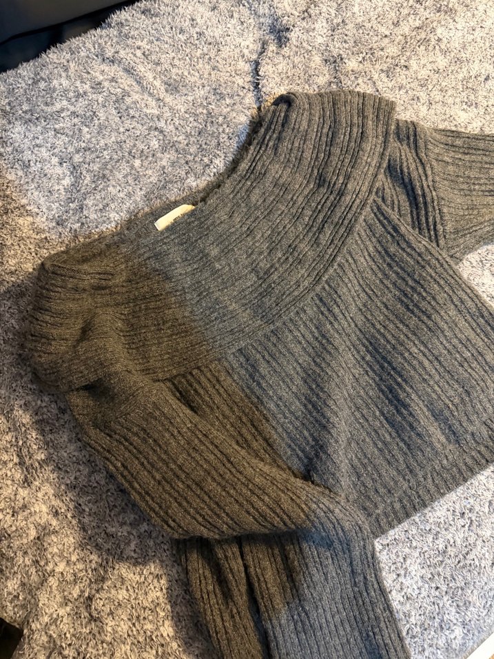 Gri renkte, kayık yaka ve uzun kollu, triko dokulu, vücuda oturan rahat kesim kazak.