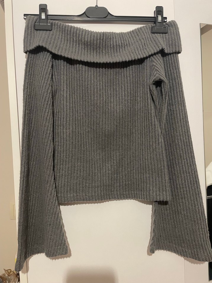 Gri renkte kayık yaka ve uzun kollu ince kazak. vücudu sarar small beden 2 tane deliği var ama yaka kısmında ve iç tarafta olduğu için gözükmüyor. omuz kısmı lastikli madonna yaka