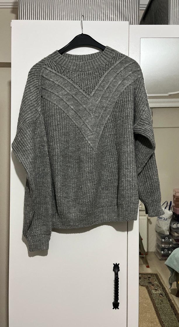 Gri renk, bisiklet yaka, uzun kollu kadın triko kazak. Rahat kesim ve yumuşak örgü kumaştan yapılmıştır, günlük kullanıma uygundur.