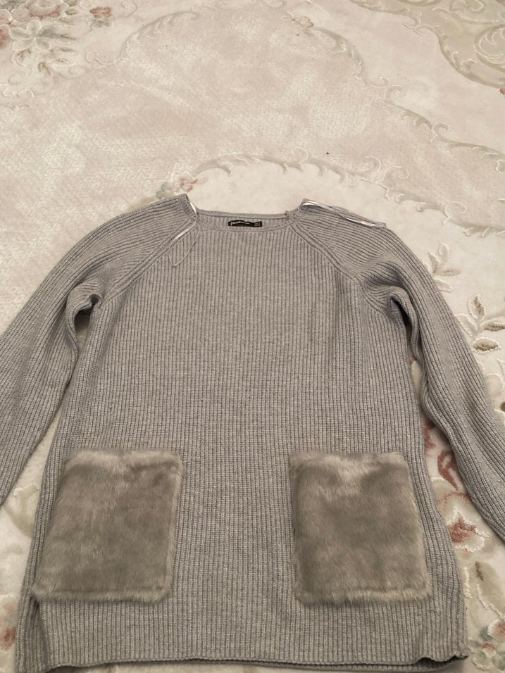 Gri renkli, uzun kollu, yuvarlak yakalı, bol kesim triko kazak, kürk detaylı ceplere sahiptir.