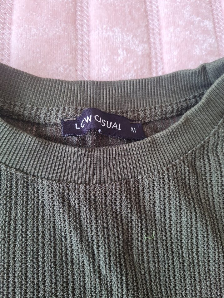 Haki renkli, yuvarlak yakalı ve uzun kollu kadın triko kazak. Rahat kesimi ve örme sentetik kumaşıyla günlük ve sokak stiline uygundur. M bedendir.