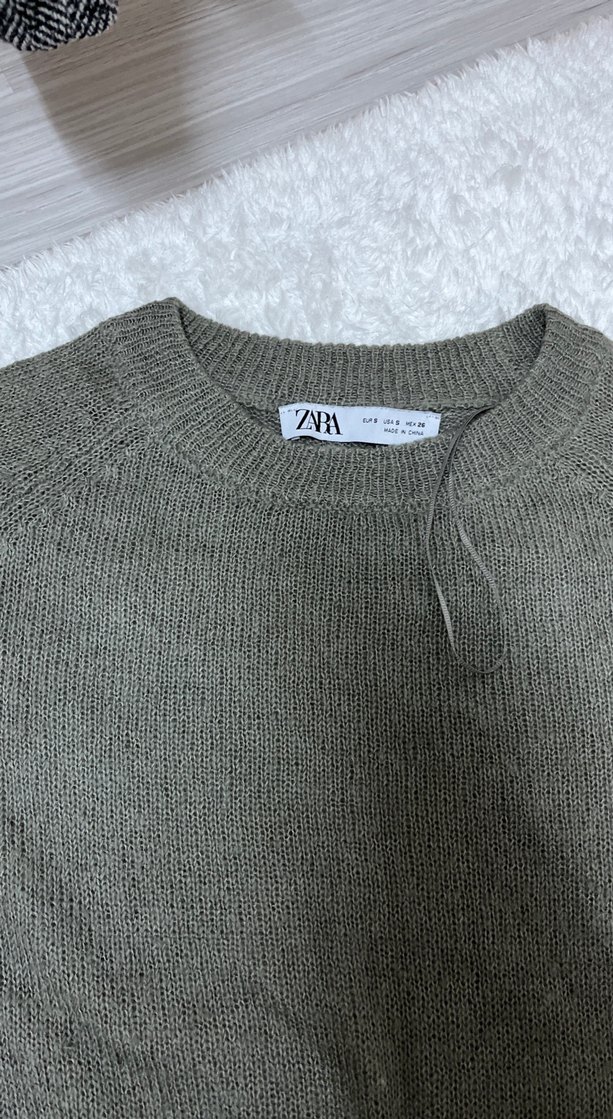 Zara markalı gri renkli, yuvarlak yaka, uzun kollu kadın triko kazak. Rahat kesim ve normal boyda, günlük sokak tarzına uygun.