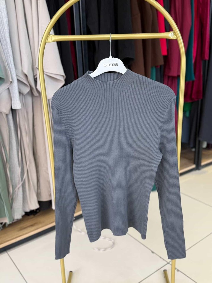 Gri renkli, bisiklet yaka ve uzun kollu kadın triko kazak. Rahat dokusu ve kısa kesimiyle günlük sokak stiline uygundur.