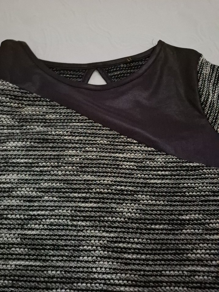 Dar kesim, kruvaze yaka ve uzun kollu kadın triko elbise. Yumuşak sentetik kumaştan, gri renkte ve ön yüzde hafif çapraz detaylı. Midi boy, günlük kullanıma uygun.