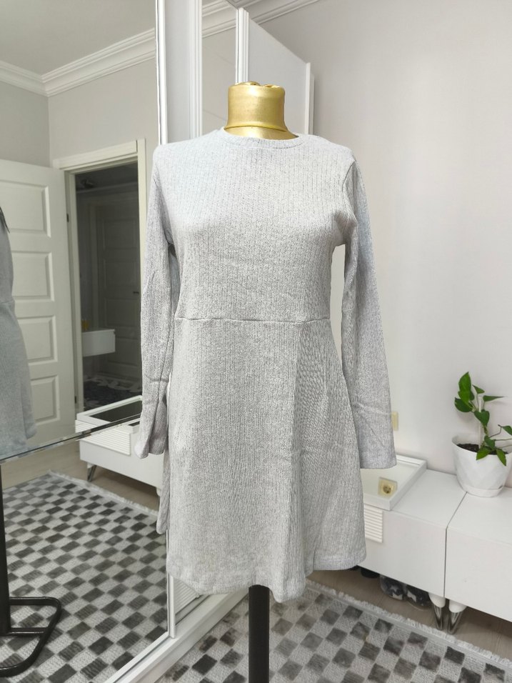 Gri renkte, bisiklet yaka ve uzun kollu, triko dokuma keten kumaştan midi elbise. Rahat kesimli ve normcore tarzda, günlük kullanıma uygun. boy uzunluk 80 cm kol altı genişlik 42 cm