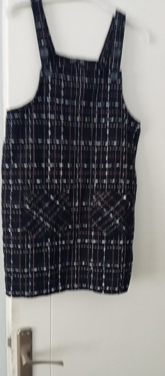 Kolsuz, yüksek yakalı, triko kumaştan, koyu gri tonlarda batik desenli, fitted midi uzunlukta elbise.