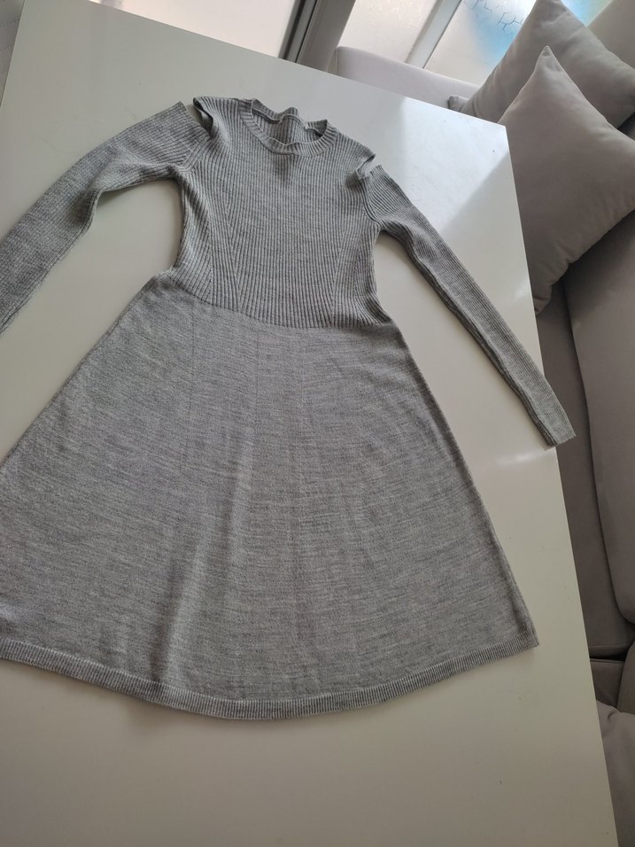 Uzun kollu, bisiklet yaka, yumuşak yün kumaştan yapılmış, gri, fitted kesim triko midi elbise. Günlük kullanıma uygun rahat ve şık. Hiç bir sorunu yoktur