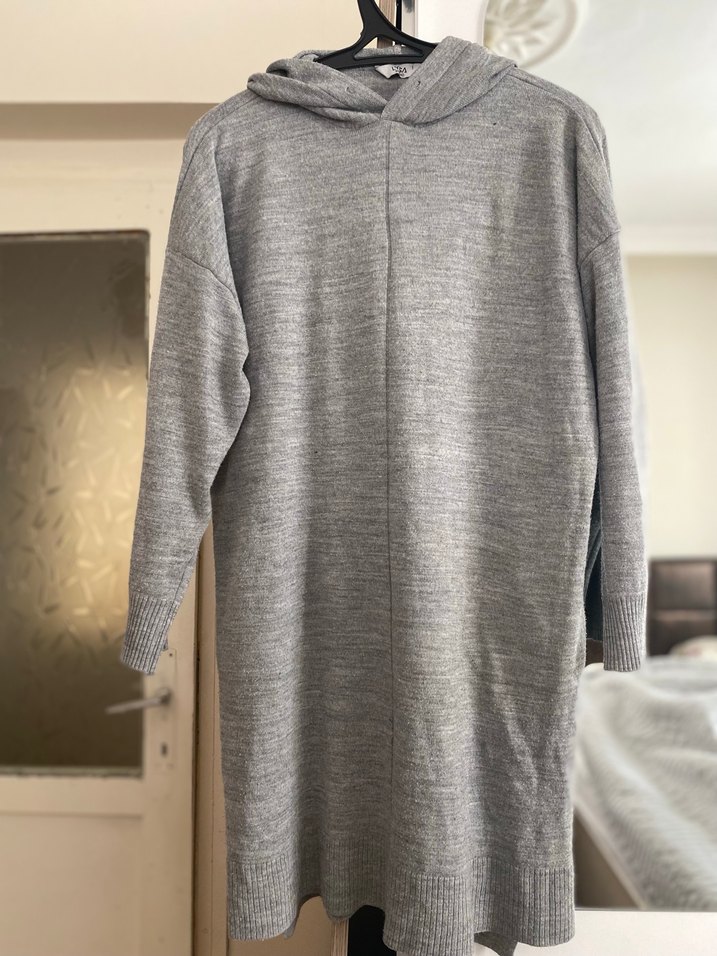 Yumuşak yün kumaştan yapılmış, yüksek yakalı ve uzun kollu gri triko midi kazak. Rahat ve bol kesim, günlük kullanım için ideal.