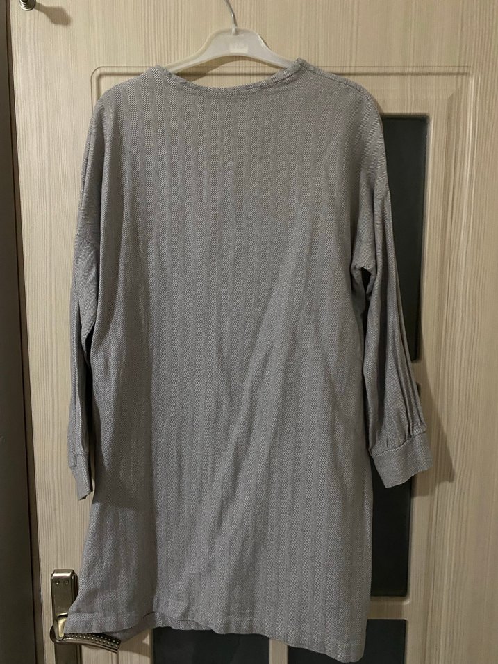 Gri renkli, uzun kollu ve yuvarlak yakalı, rahat kesim triko elbise. Yumuşak keten kumaştan, pilili detaylı ve midi boyda, günlük kullanım için uygundur.