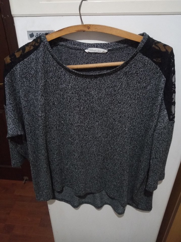 Gri renkli, crew neck yakalı, omuzlarında dantel detaylı uzun kollu kadın triko kazak. Salaş kesimi ve örme kumaşıyla rahat bir sokak stili görünümü sunar.