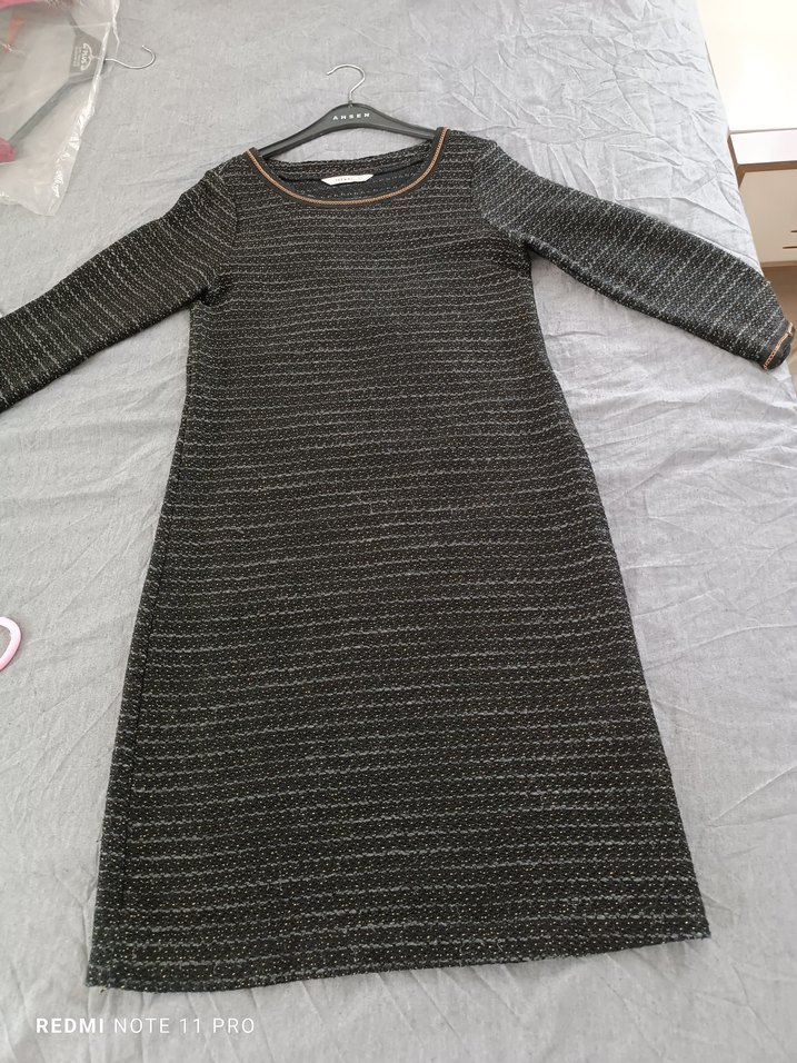 Gri tonlarda, triko dokulu sentetik kumaştan, uzun kollu ve fitted kesim kadın elbisesi. Rahat ve gündelik kullanıma uygun.