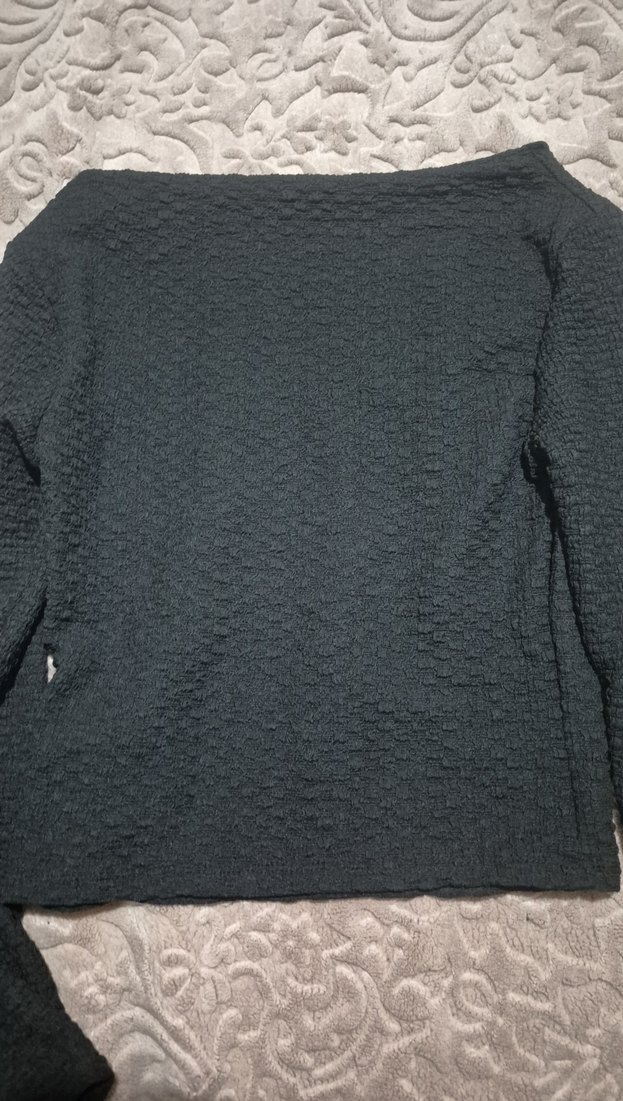 Gri renkli, uzun kollu, kayık yaka ve dokulu örme desene sahip, vücuda oturan triko bluz. Normal midi boyunda, rahat sokak stiline uygundur.