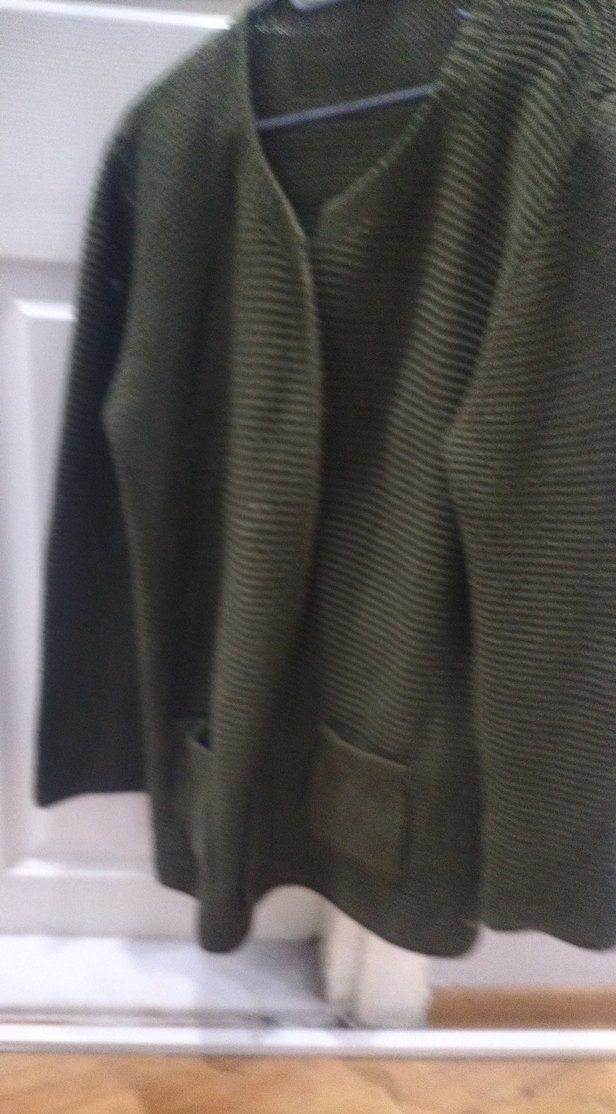 Gri renkte, yün triko kumaştan, normal uzunlukta ve uzun kollu, yakası kesimli kadın hırka. Rahat ve günlük kullanıma uygun.