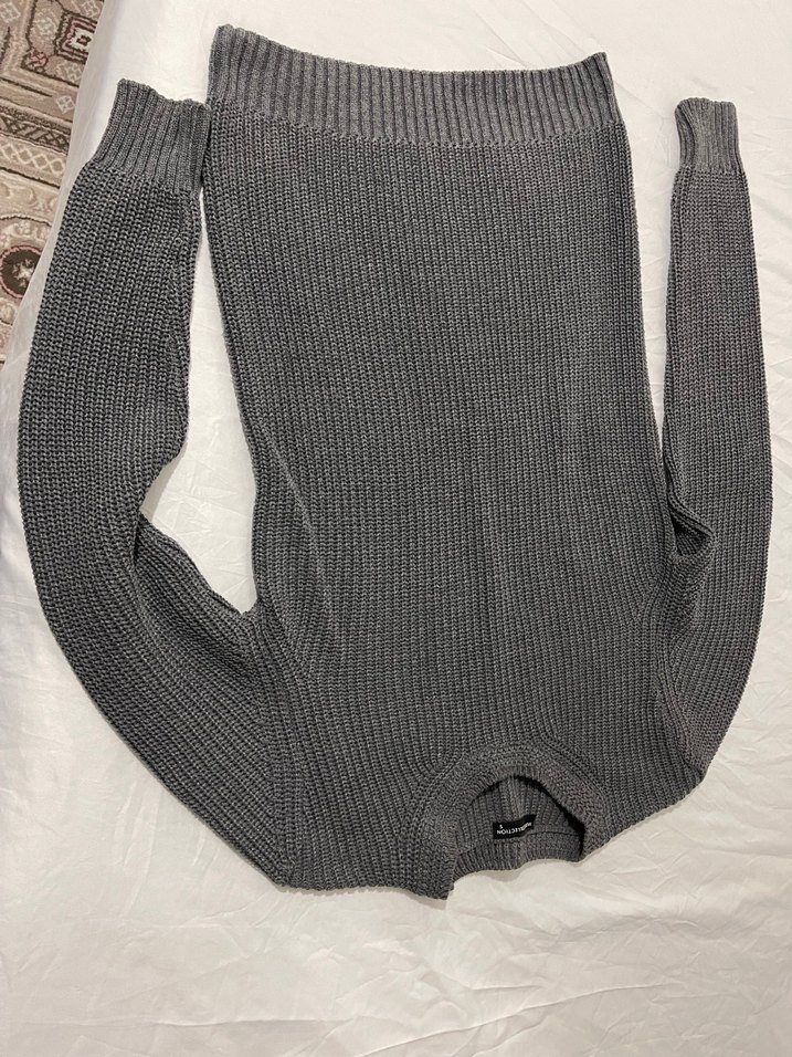 Gri, fitted kesim, yuvarlak yaka ve uzun kollu, yumuşak triko kumaştan yapılmış kazak. Normal boy ve desensiz tasarımıyla günlük sokak stiline uygundur.