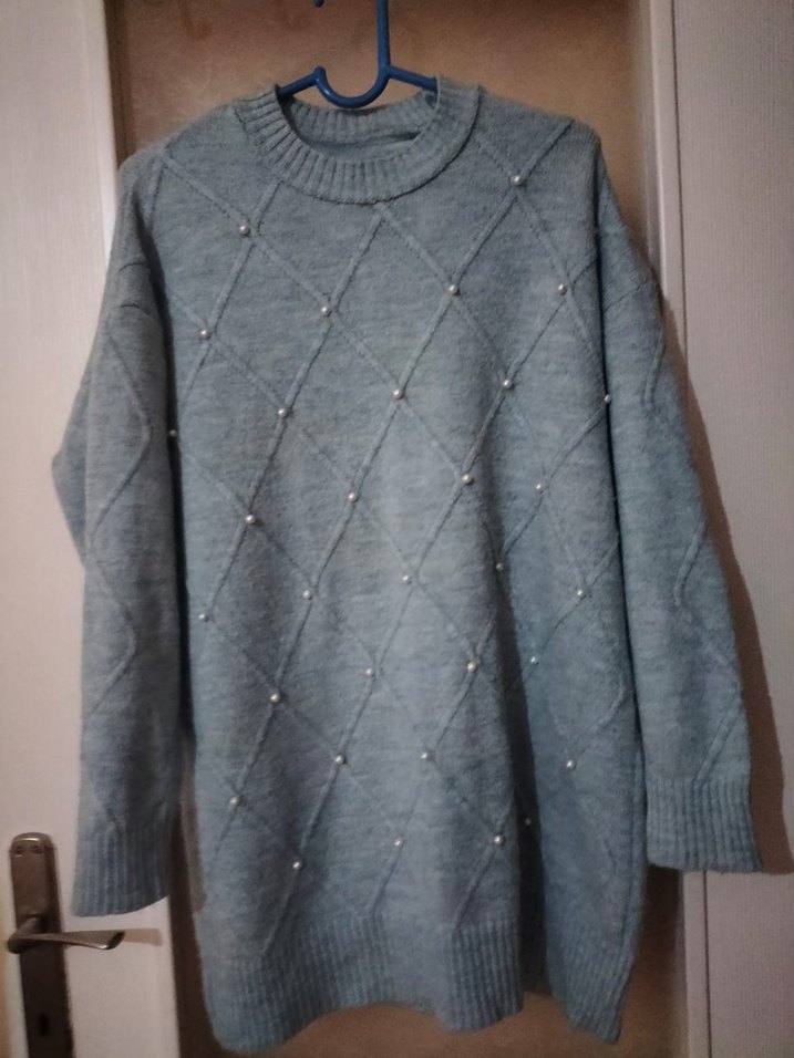 Gri, yuvarlak yaka ve uzun kollu, triko kadın kazak. Rahat ve normal boy midi uzunluğunda, ince inci detaylarıyla sade tasarım.