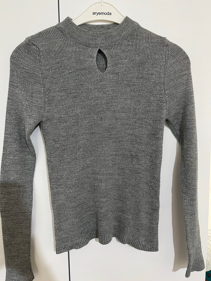 Gri renkli, uzun kollu, triko kumaştan yapılmış, ince kesimli bu kazak, ön kısmında küçük bir yırtmaç detayı ve yuvarlak yaka içerir. Simli şık gecelere uygun