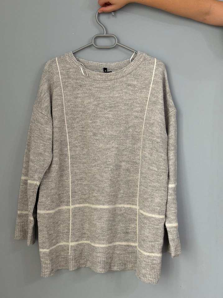 Gri yün, uzun kollu, yuvarlak yaka, örme dokulu, bol kesim kadın kazak. Günlük kullanıma uygun rahat bir parça.