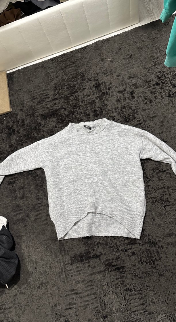 Gri renkli, yumuşak yün kumaştan örülmüş, uzun kollu ve bisiklet yaka kadın kazak. Rahat ve bol kesim, günlük kullanıma uygun.