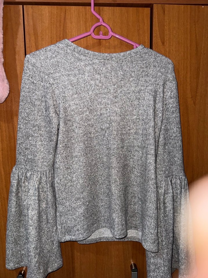 Gri renkli, triko kumaştan üretilmiş, uzun ve geniş kollu, yuvarlak yaka, bol kesim kadın kazak. Rahat ve günlük kullanıma uygun.