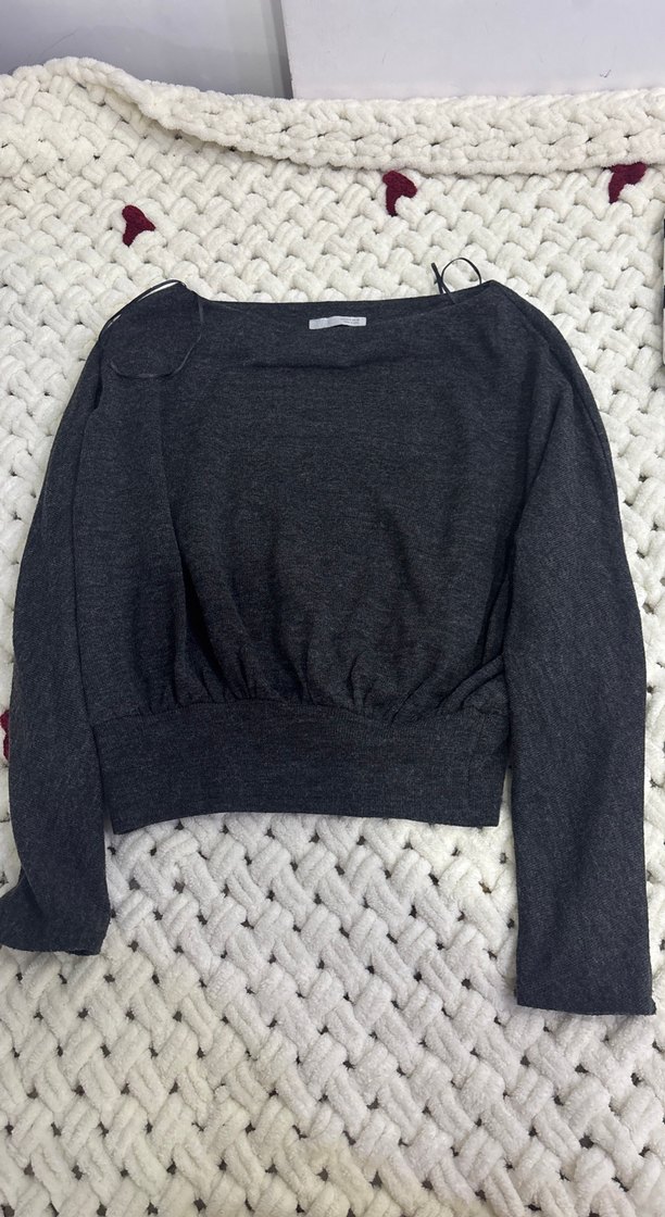 Gri renkli, yuvarlak yakalı ve uzun kollu triko kazak, rahat kesimiyle günlük kullanıma uygundur.