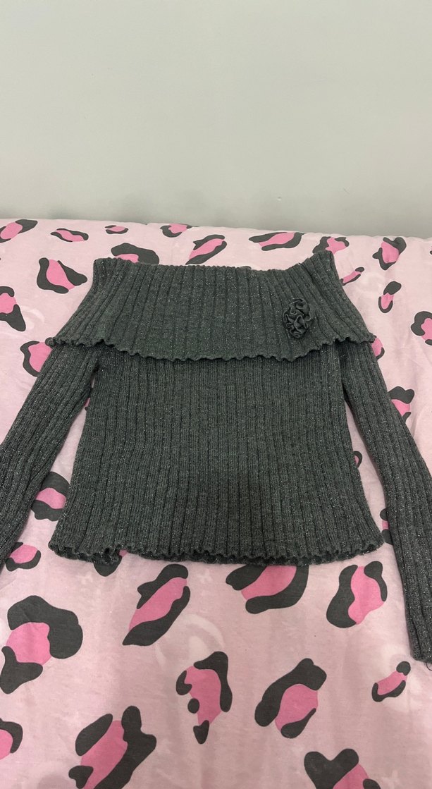 Fitted kesim gri triko kazak, uzun kollu ve omuz detaylıdır. Çiçek aksanlı ve normal boyda, rahat sokak stili için uygundur.
