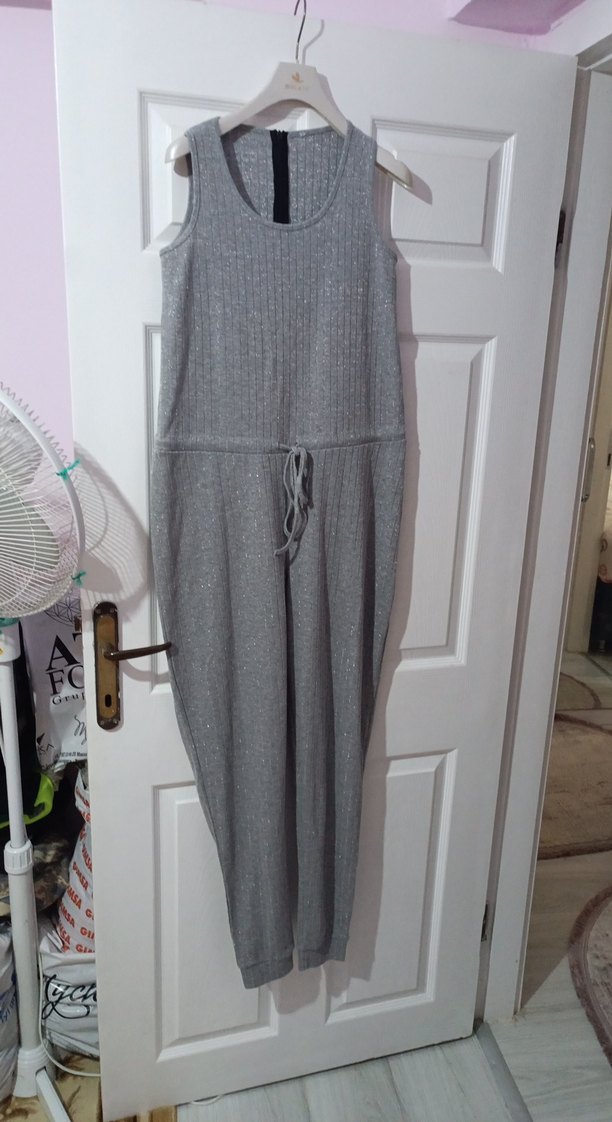 Gri renkte, kolsuz ve bisiklet yaka triko uzun tulum. Belinde ayarlanabilir bağcık bulunur, günlük rahat kullanım için uygundur.