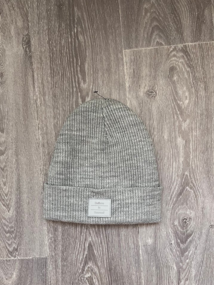 Gri renkte, örgü yün malzemeden yapılmış sade ve rahat kadın bere, günlük kullanıma uygundur.