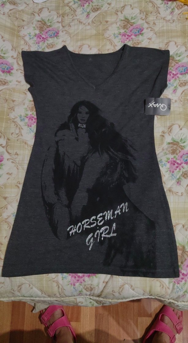 Gri, kısa kollu, V yaka uzun tunik kadın tişörtü. Gevşek kesim, gotik baskılı Sentetik kumaştan üretilmiştir.