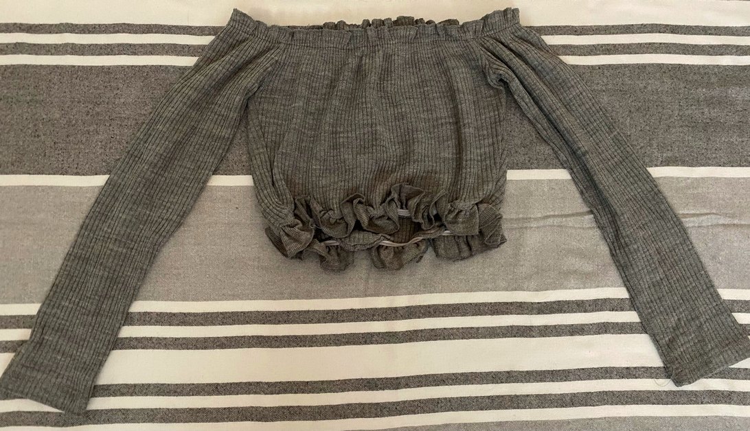 Gri keten kumaştan, kayık yaka ve uzun kollu kısa kesim, bol ve fırfırlı detaylı kadın kazak tarzı üst defosu yoktur az kullanılmıştır.Geri iade yoktur.