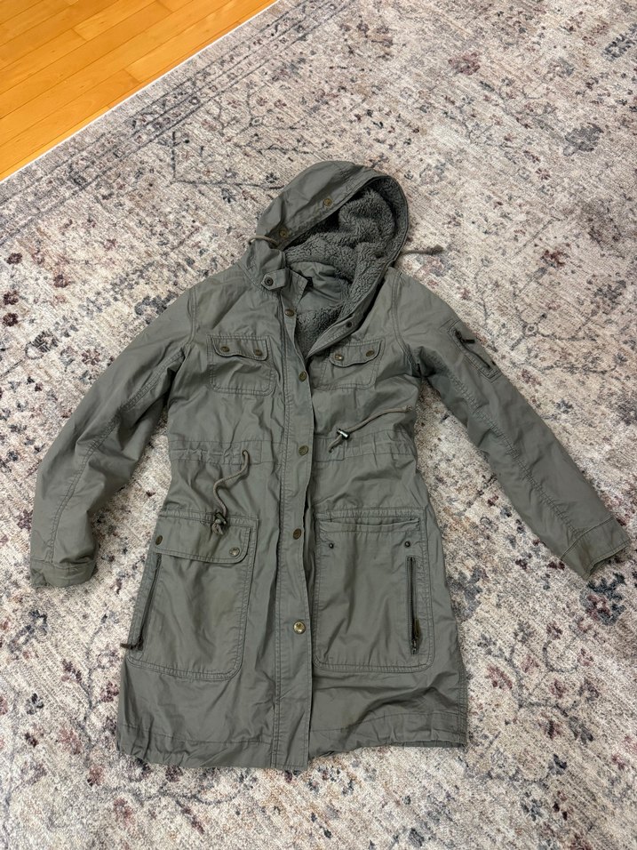 Kol kısmında bir leke var fotoğrafa ekledim başka hiçbir sıkıntısı yok. Bayadır giymediğim için satılık. 85 cm boy 45 cm en. İçindeki tüylü kısmı tamamen çıkınca yağmurluk olarakta kullanılabiliyor.
